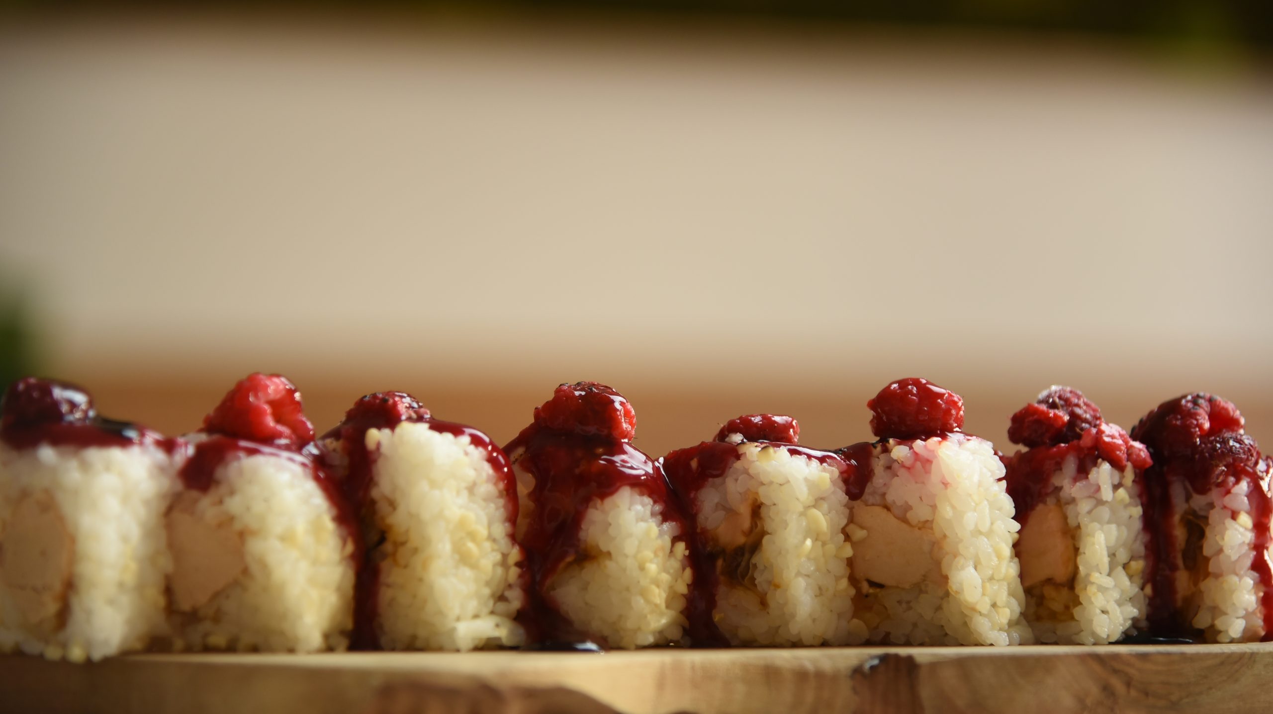 Este nuevo California roll de foie y cebolla caramelizada, esta creado por nuestros mejores Chefs, este roll está cubierto con cacahuete molido, coulis de frutos rojos y frambuesas flambeadas, estos ingredientes le dan un toque dulce y crujiente que solo podrás disfrutas en Makitake.