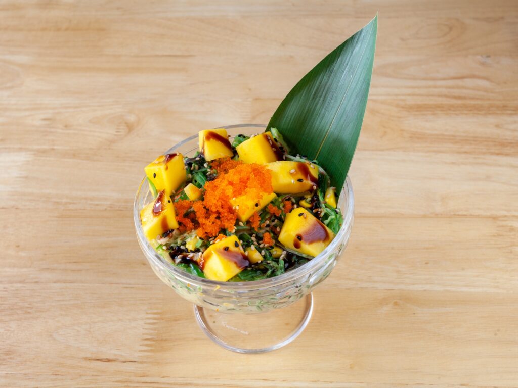 Suiko Salad es una deliciosa ensalada japonesa que viene cargada de sabor. Entre sus principales ingredientes tienen algas wakame, mango, maíz dulce, salsa spicy y ensalada de kanikama.
