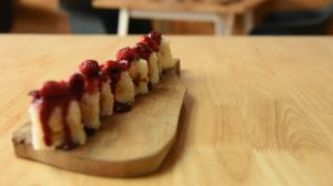 Te presentamos una propuesta creada por nuestros chefs el California roll de foie y cebolla caramelizada, este roll esta cubierto con cacahuete molido, coulis de frutos rojos y frambuesas flambeadas, dándole un toque dulce y crujiente con sus ingredientes de la mejor calidad, un plato único que solo podrás disfrutar desde nuestros restaurantes de sushi Makitake